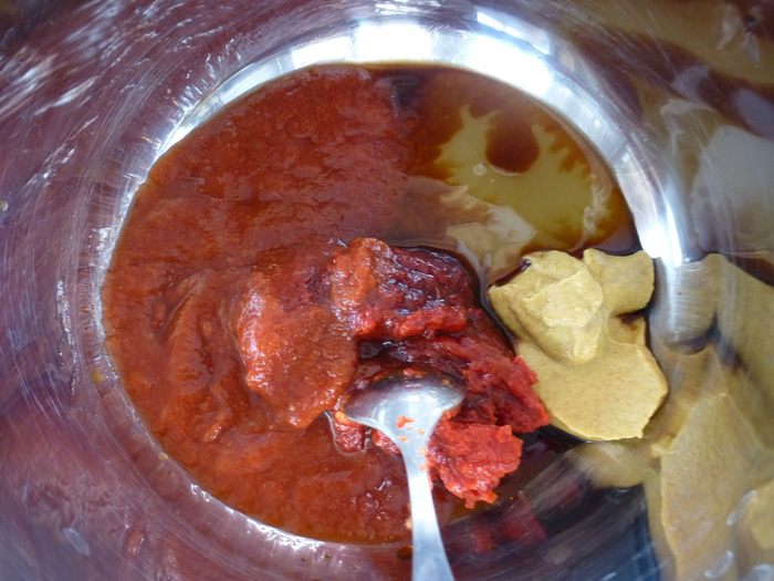 Готовим соус. Для этого в сотейнике соединяем томатную пасту, пиво, кетчуп (у меня домашний), мед и горчицу, вустерский соус (можно и без него).