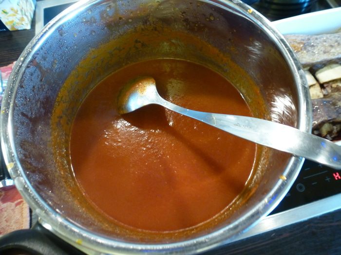 В соус выливаем бульон из мяса, который образовался после томления. Солим, перчим по вкусу. Увариваем соус на среднем огне 15 минут до загустения.