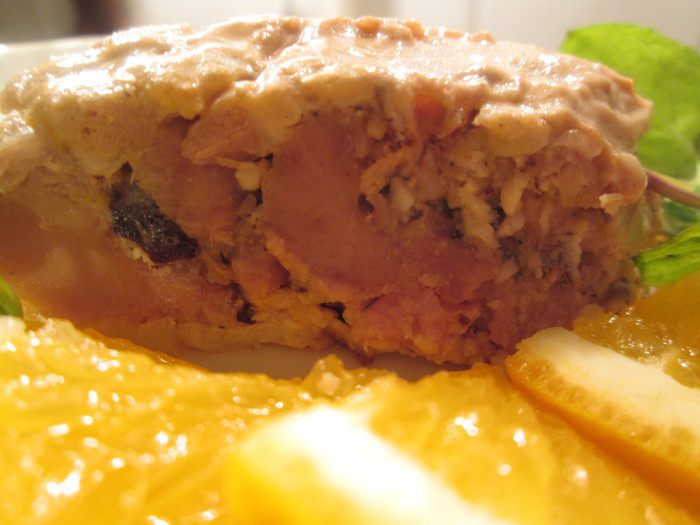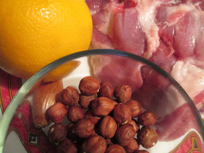 Оставшуюся половину филе утки и свиную шейку измельчаем в мясорубке, добавляем яйцо, лук, рубленные орехи и вторую половину сока.