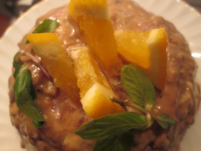 Нарезаем 1/2 часть филе утки небольшими кусочками, смешиваем с 1 ст. л. масла, с 1/2 частью сока, цедрой апельсина, коньяком, тимьяном, солью и перцем.