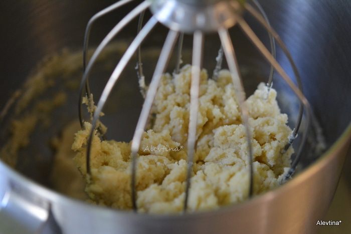 Добавить сливочное масло комнатной температуры. Смешать в крошку примерно 2 минуты.