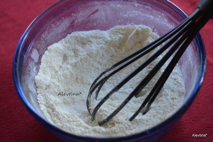 Смешать на медленной скорости в емкости муку, сахар 1/4 стакана, миндальную муку.