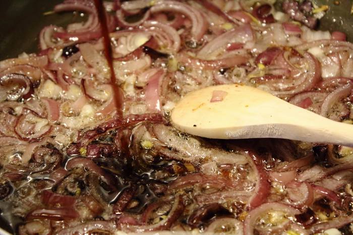 Лук очистить и нарезать полукольцами. Обжарить на сковороде до золотистых корочек.