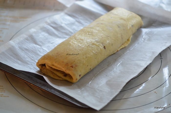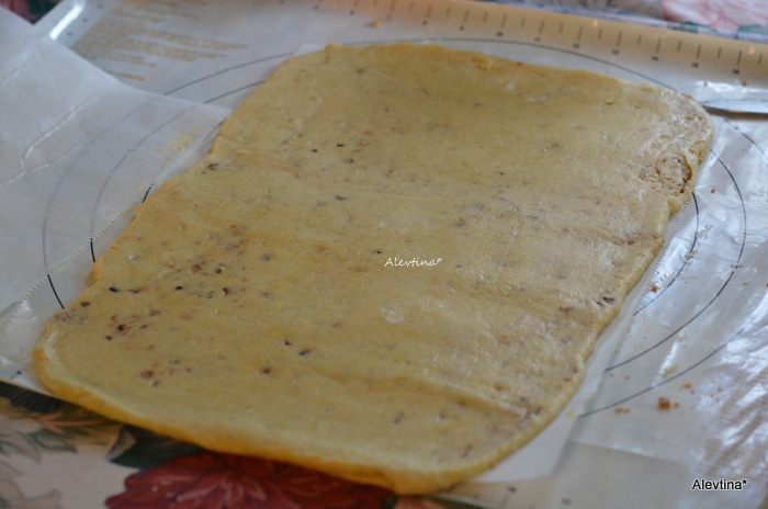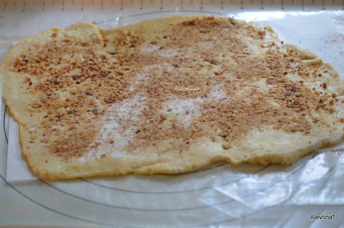 Тесто положить в пакет и убрать в холодильник на 30 минут. Холодное тесто раскатать, посыпать размолотыми поджаренными орехами.