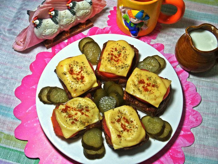 Вкуснее гренок могут быть только...гренки в пикантной обжарке,с расплавленным сыром и овощами между ними!