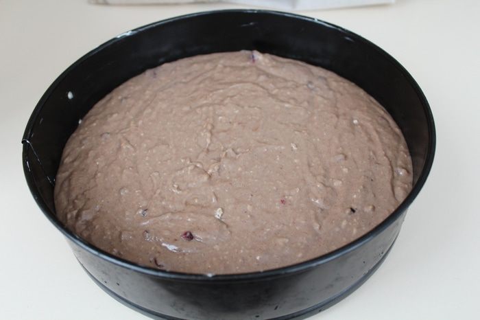 Выливаем в большую смазанную форму 26 см (пусть вас не смущает этот цвет!), ставим в разогретую духовку 200°C. Выпекаем 40-50 минут, готовность проверяем деревянной шпажкой.