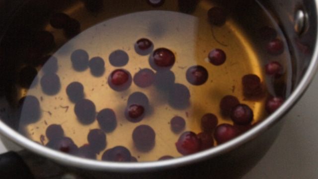 Клюкву засыпать в кастрюлю, залить травяным отваром и поставить на плиту. Кипятить 10 минут на медленном огне.