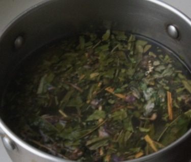 Сухие травы (зверобой, душица и мята) засыпать в кастрюлю, залить кипятком. Оставить настояться на 10 минут.
