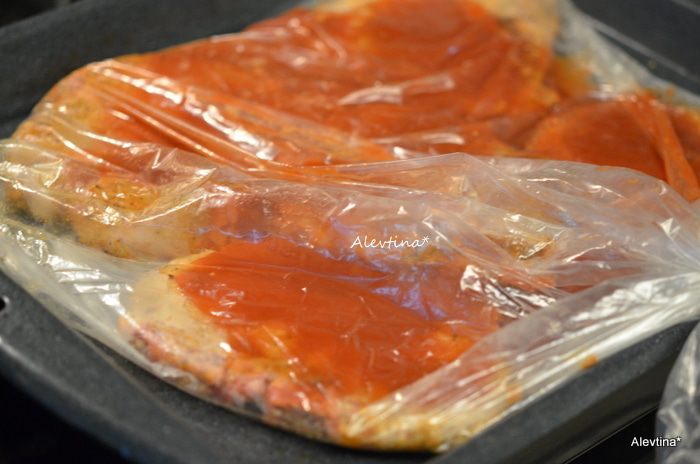 Переложить в пакет или в рукав для готовки и залить смешанным кетчупом с водой и сухими специями. Закрыть, сделать 4 надреза сверху в разных местах. Поставить в разогретую духовку на 180°С на 40-45 минут.