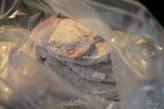 Выложить в пакет и аккуратно перемешать с каждой свиной котлетой с обеих сторон.