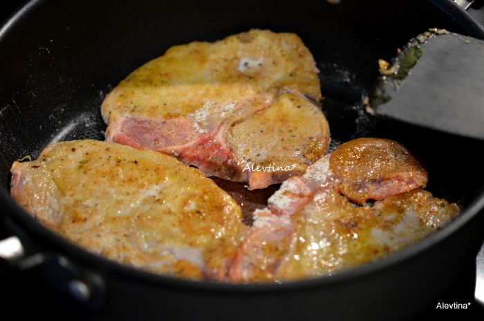 Обжарить свиные котлеты на разогретой сковороде на масле с обеих сторон.