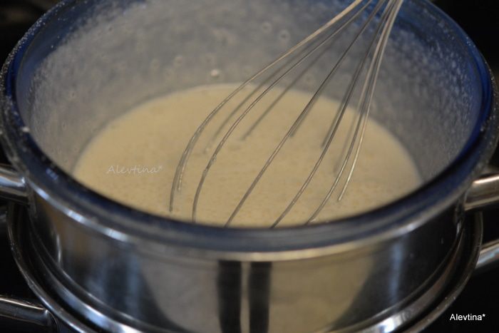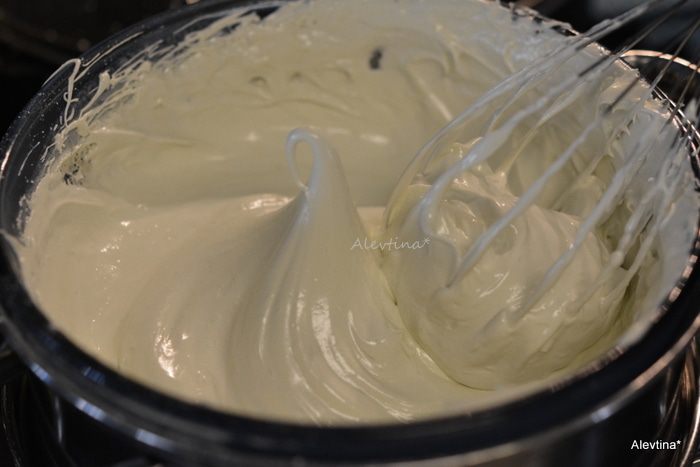 Приготовим водяную баню. Стеклянная посуда должна быть чистой и не соприкасаться с горячей водой. Выложить в нее белки, сахарную пудру. Взбиваем 5-7 минут на скорости, добавляем по желанию винный камень, он стабилизирует белки, дает устойчивость.