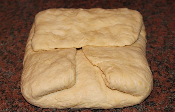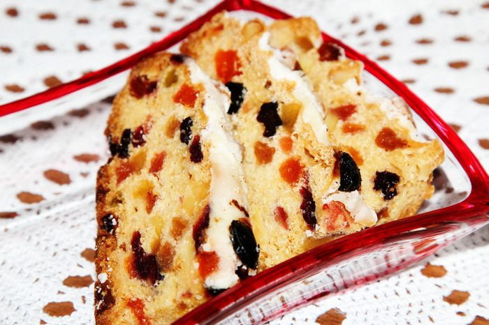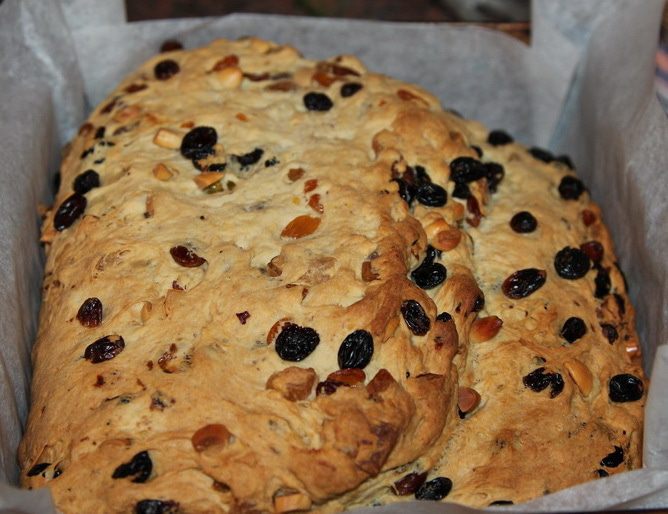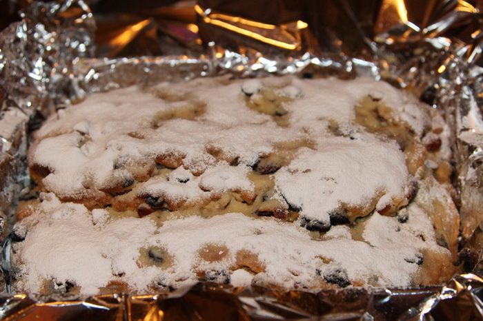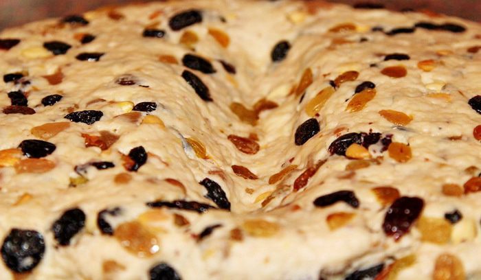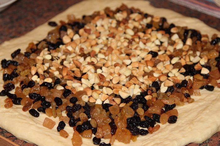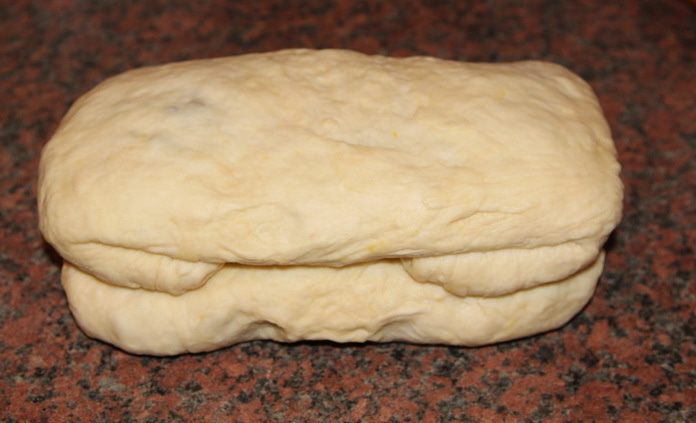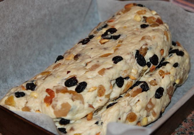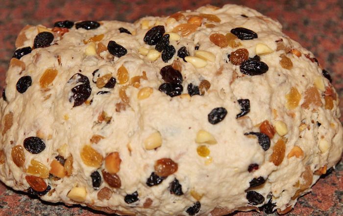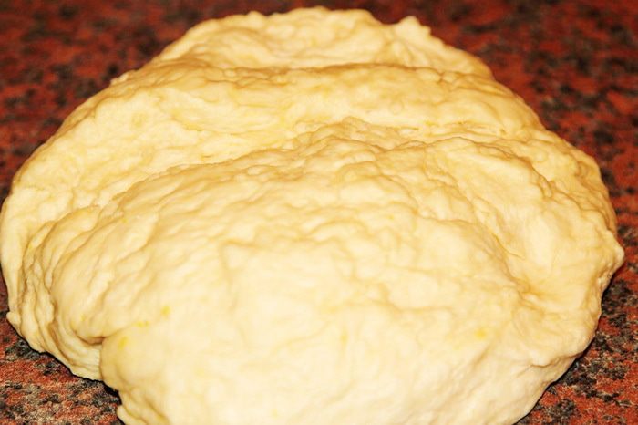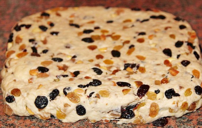 Утром, с хорошим настроением, начинаем заниматься штолленом. Дрожжи развести в теплом молоке, вмешать сахар и просеять 2 стакана муки. Поставить в теплое место. Потребуется от 20 до 30 минут, в зависимости от окружающей температуры. Когда опара запузырится и подойдет, просеять еще 3 стакана муки, добавить 200 г размягченного масла, соль, ванилин, цедру лимона и замесить тесто. Вот теперь нам может понадобиться оставшиеся пол-стакана муки, но не все. В это году мне понадобилось добавить муки, еще половину от половины стакана. Тесто должно быть мягким, податливым, приятным и не липнуть к рукам. Но чтобы не забить тесто лишней мукой, оставшуюся муку добавляйте понемногу. Скатываем тесто в шар, помещаем в емкость, накрываем полотенцем и оставляем подходить на 1 час. После этого обминаем тесто и еще даем подойти минут 40-50.