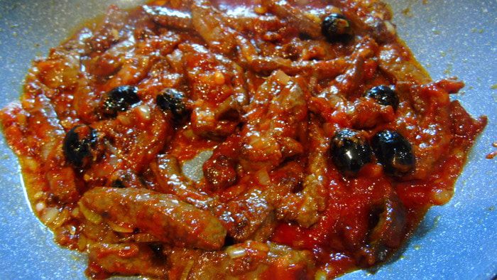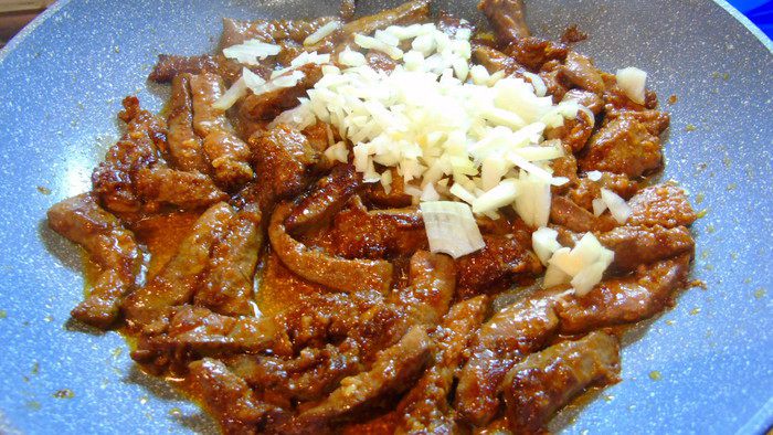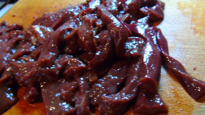 Печень, если говяжья, очистить от пленки, и нарезать полосочками.
