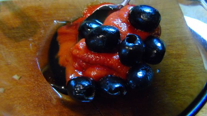 В отдельной мисочке смешайте мед, томатную пасту и маслины.