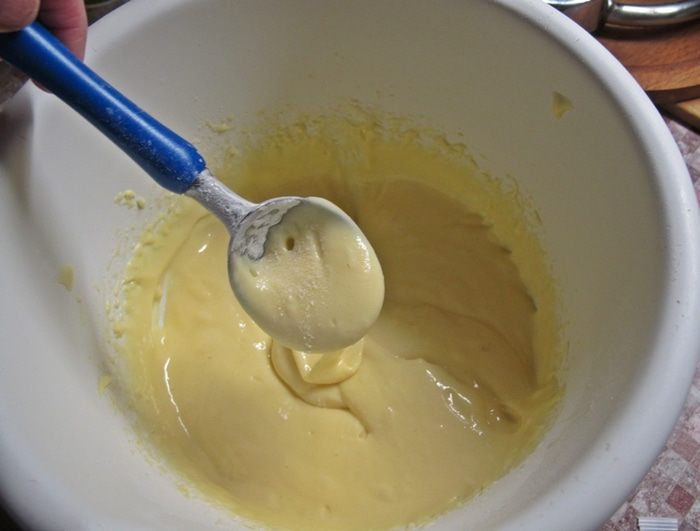 Яйца взбить с сахаром, продолжая взбивать, добавить сметану и майонез. Муку смешать с разрыхлителем и ввести в смесь. Хорошо взбить. Тесто должно быть, как очень густая сметана.