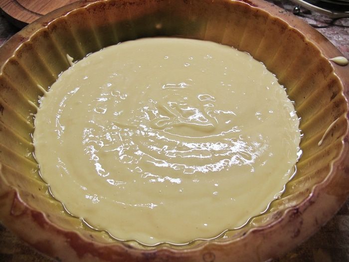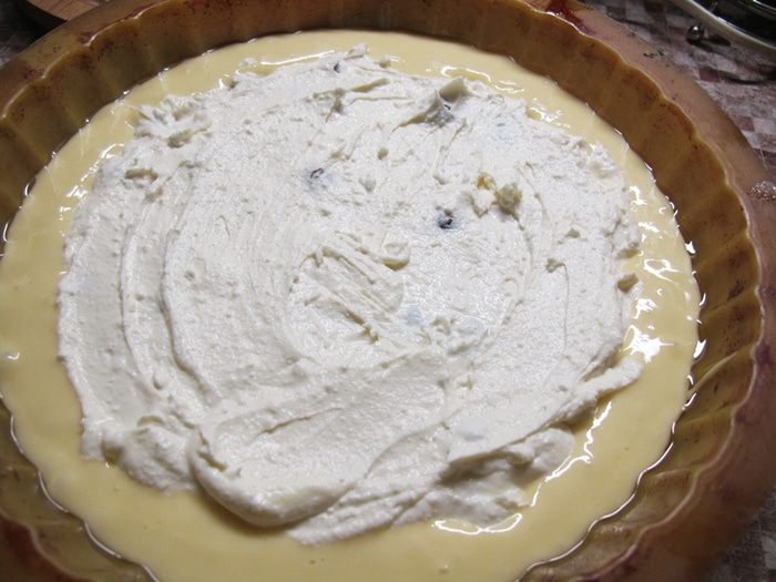 А теперь поверх теста выкладываем творожную начинку. Она немного утопает в тесте, так и должно быть. Главное распределить ее равномерно по всей форме, ближе к краям.