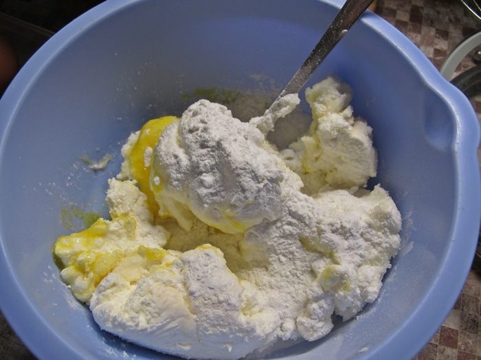 Творог не должен быть сухим. Если у вас творог с комочками пробиваем его блендером. Добавляем сахар, крахмал, яйцо, ванилин и хорошо перемешиваем.