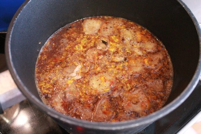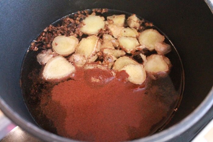 Имбирь нарезать. Если не любите острый вкус имбиря — уменьшите количество в половину. Добавить в сотейник имбирь, гвоздику, корицу.