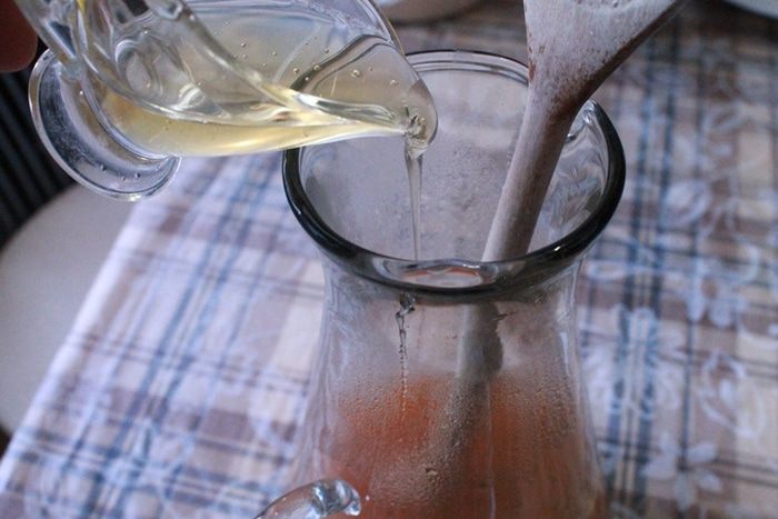 Наш будущий напиток перелить в кувшин, остудить 5 минут и добавить протертую облепиху. Следом влить мед и перемешать.
