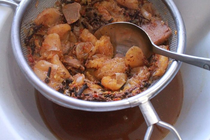 Добавить нарезанные мандарины и проварить еще 1 минуту. Все протереть через сито.