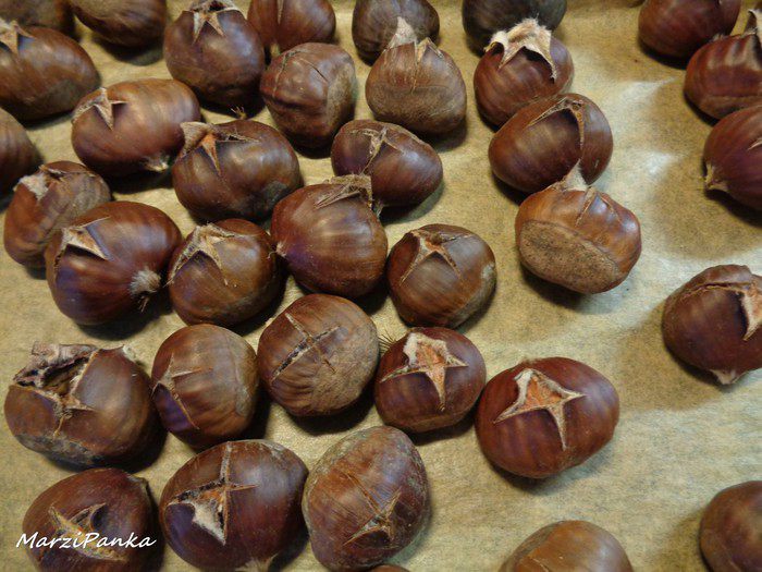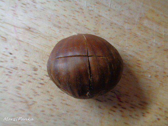 На выпуклой стороне каждого каштана сделать крестообразный надрез. Как показала моя практика, легче всего это сделать ножом для хлеба (с зубчиками).