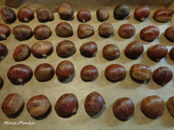 Положить каштаны на противень, застеленный пекарской бумагой, надрезами вверх. И поставить в разогретую до 200°С духовку на 20-25 минут.