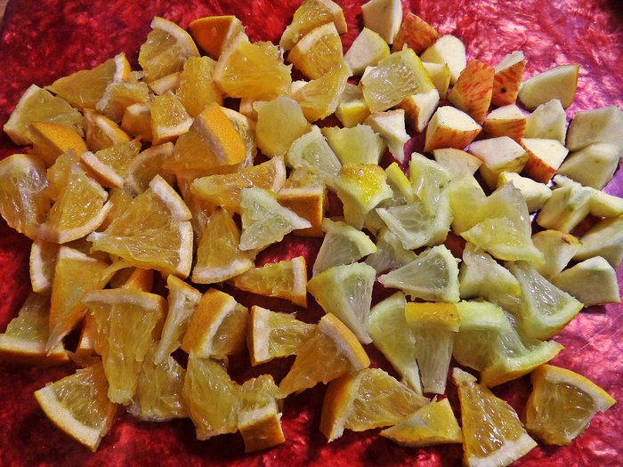 В это время нарезаем чистые фрукты (яблоко у меня маленькое, а если крупное, то тоже половинки хватит). Вместе с корочками!