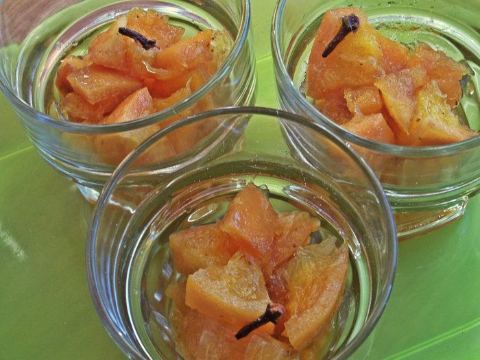 Раскладываем по стаканам обжаренные в жжёнке фрукты по 2-3 ст.л.