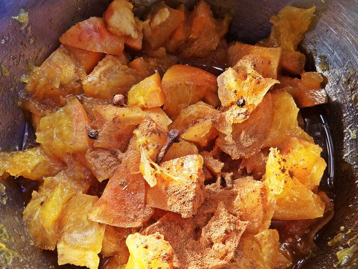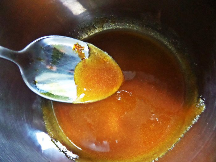 Достигаем карамельного цвета и уже мешаем ложкой.