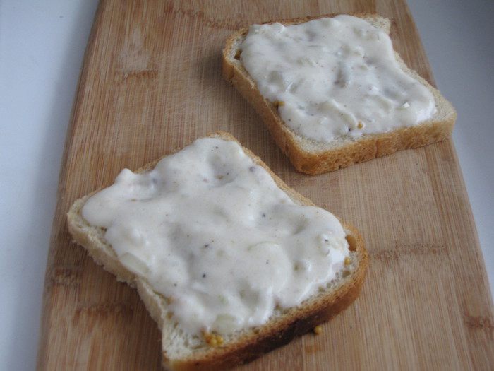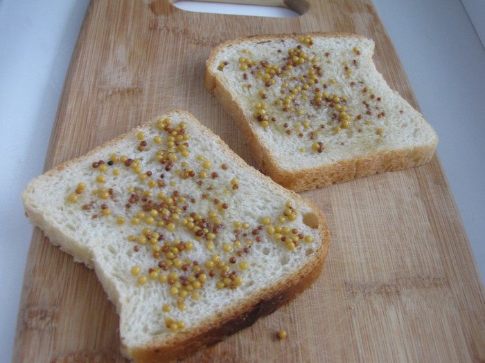 Тостовый хлеб немного смазать зерновой горчицей. Можно делать и без нее, все равно будет вкусно.