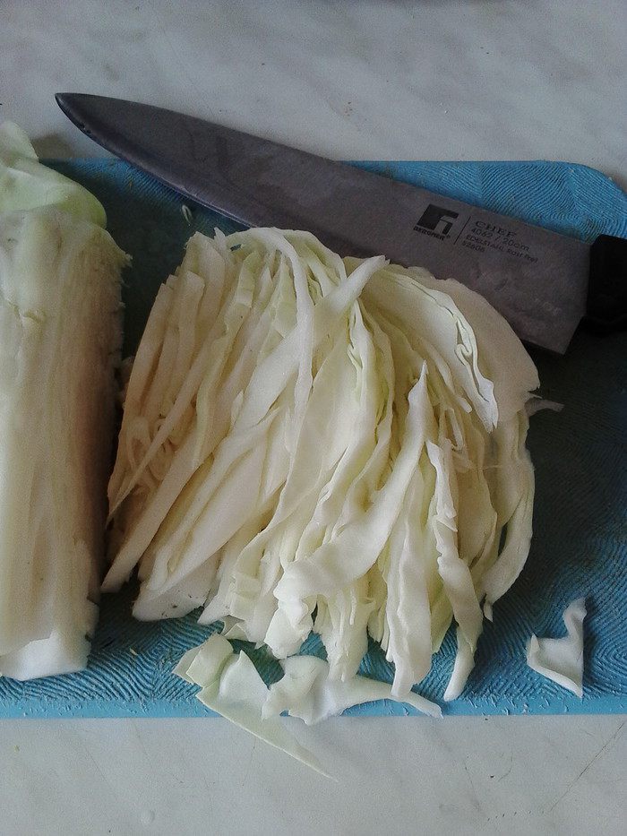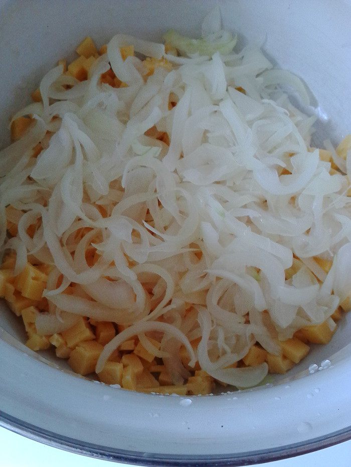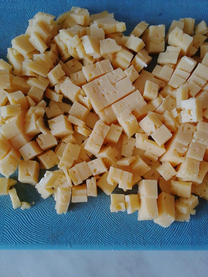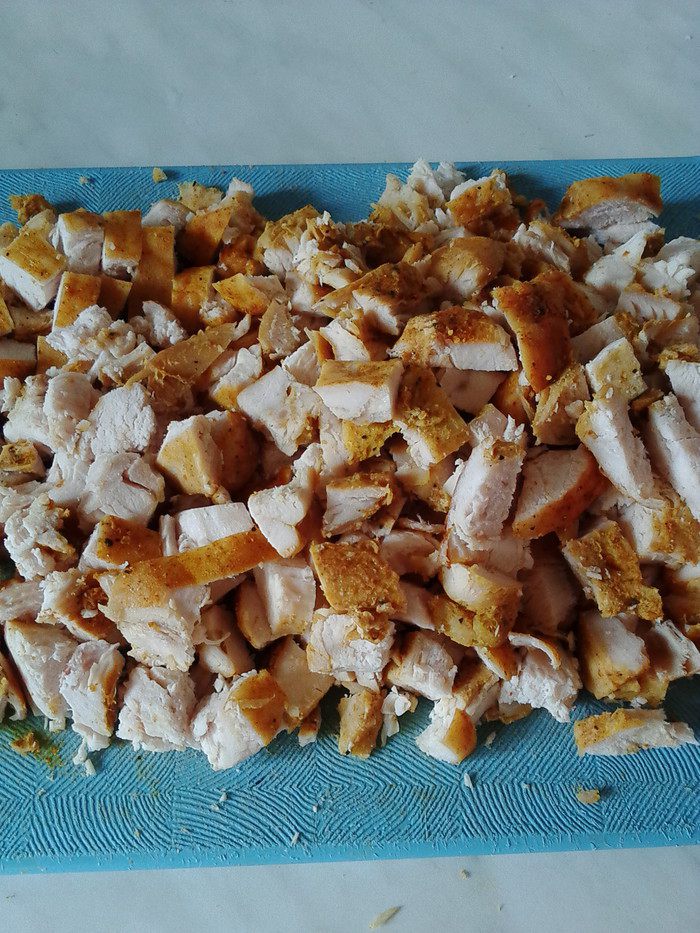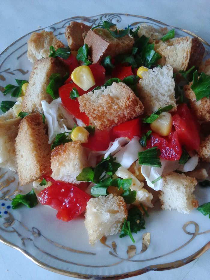 Смешать курицу, кукурузу, сыр, маринованный лук, капусту, помидоры. Сухарики (чтобы не покупать магазинные с Е-шками) лучше приготовить самостоятельно и заранее, добавив к ним при приготовлении любимые специи (я использовала соль, перец, сухой чеснок, хмели-сунели).