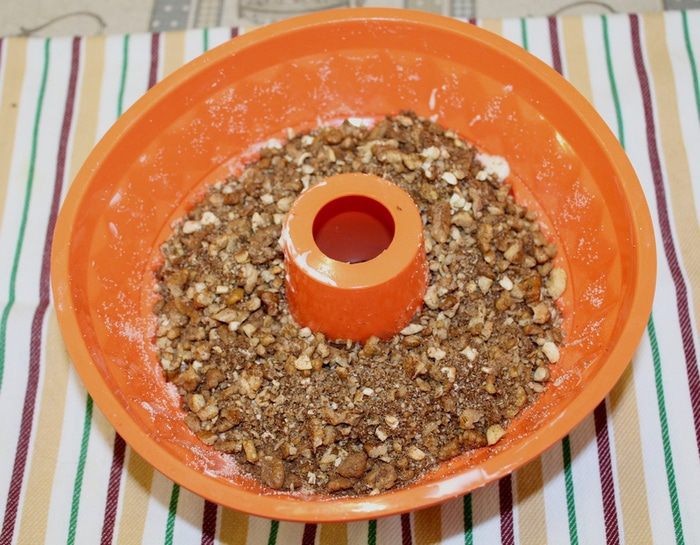 Выложите половину теста в смазанную форму, сверху выложите ореховую смесь.