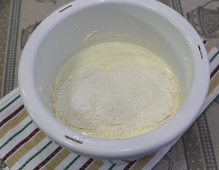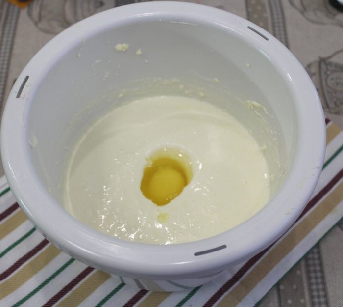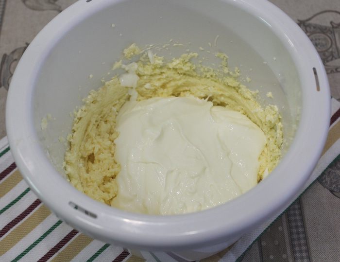 В сметанную смесь добавляем по одному яйца и продолжаем взбивать.