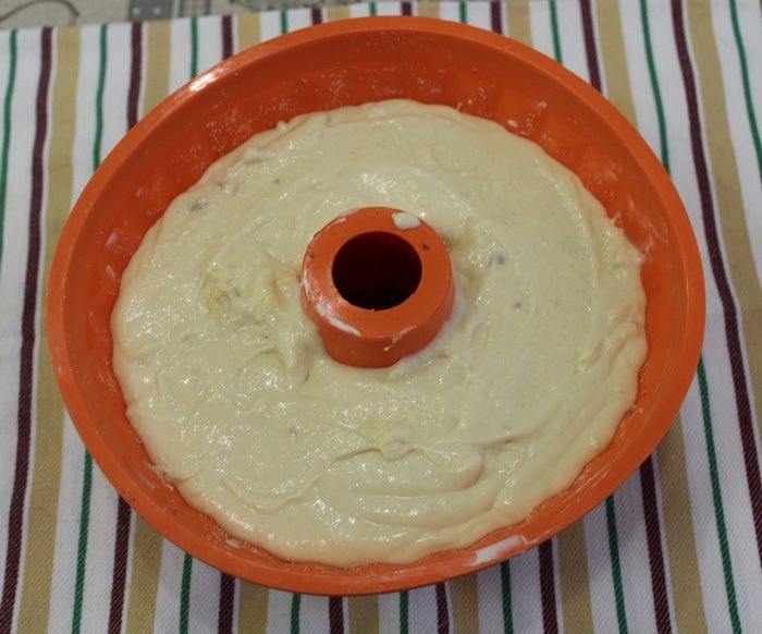 Поставить в разогретую духовку 175-180°C на 1 час, готовность проверяем шпажкой. При необходимости во время выпечки кекса, закрыть его фольгой.