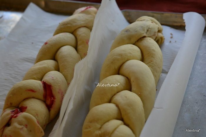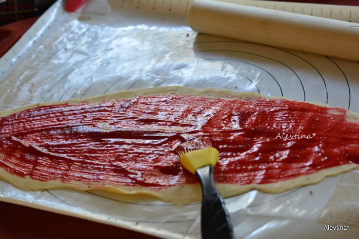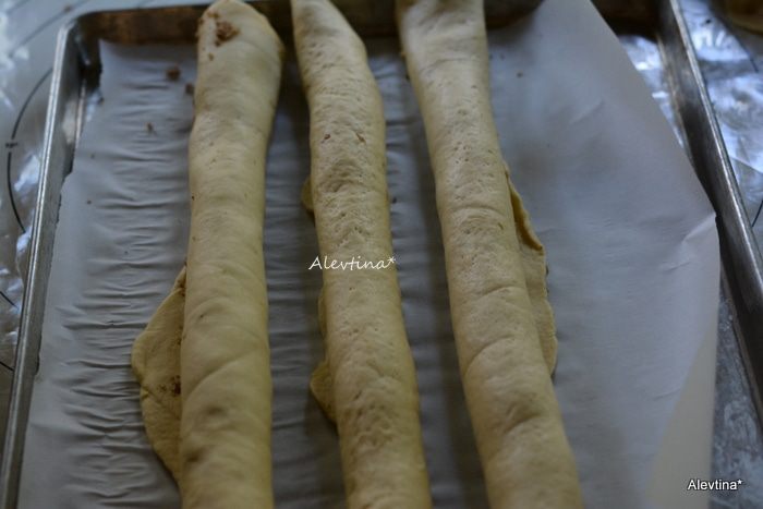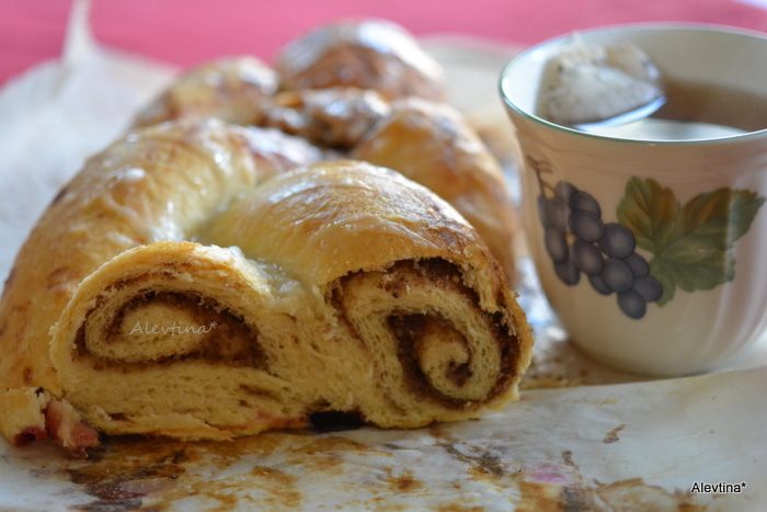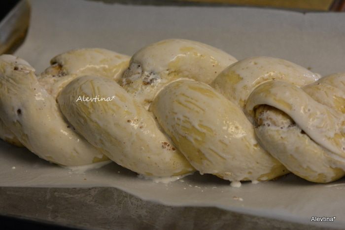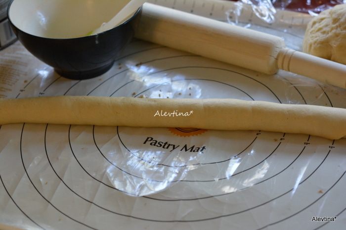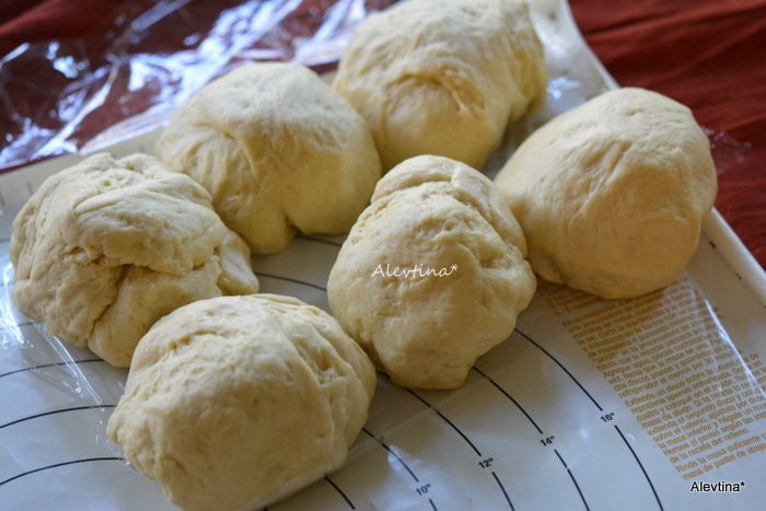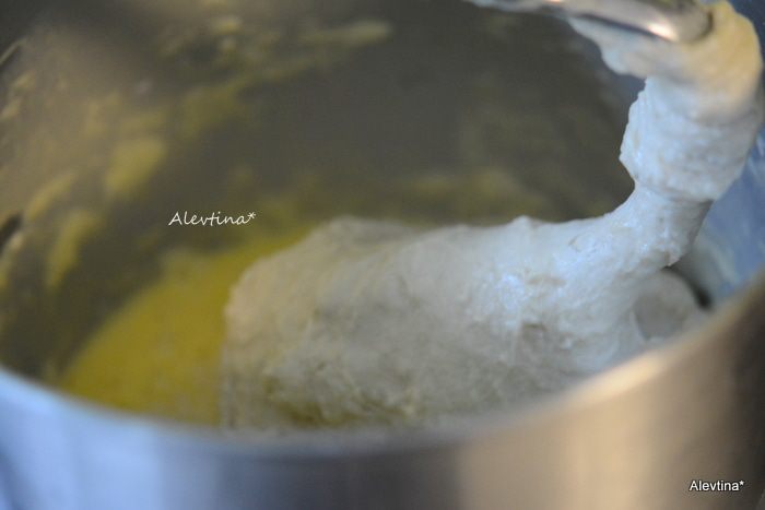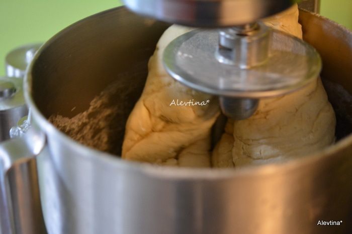 В кастрюльке растопить сливочное масло, снять с огня, добавить теплую воду, перемешать. Замес можно сделать вручную или использовать кухонный комбайн, насадка для дрожжевого теста спиральная или крючком. Влить в сухие ингредиенты маслянную жидкость, замесить. Добавить по яйцу, замесить.