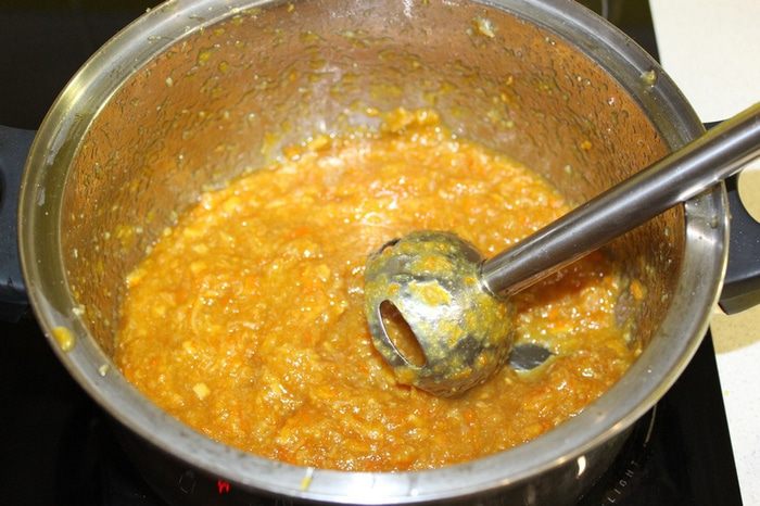 Измельчить погружным блендером, оставляя небольшие кусочки.