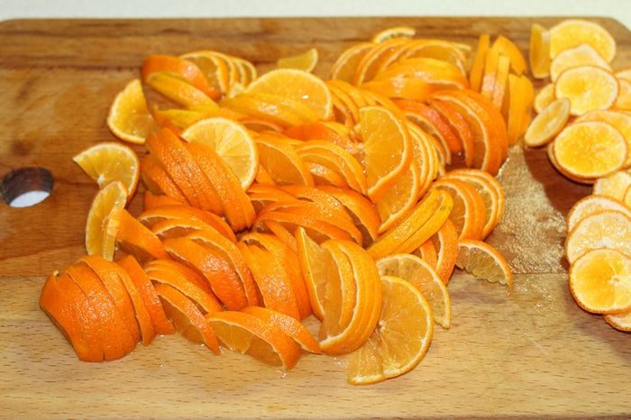 Апельсины нарезать тонкими дольками.