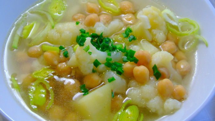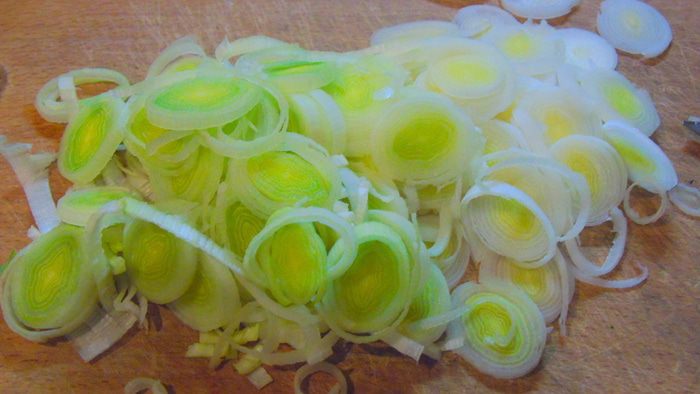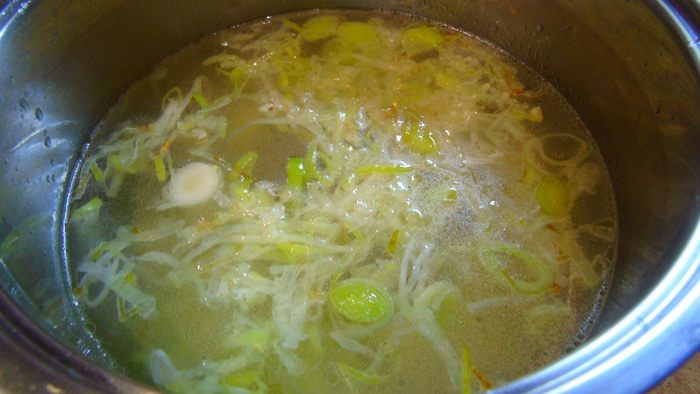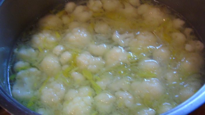 В кастрюлю с толстым дном налейте 1 ст. л. оливкового либо другого растительного масла и обжарьте лук-порей до золотистости, если вы используете кольраби, то добавьте ее к луку и обжарьте несколько минут, добавьте мелко нарезанный чеснок, и нарезанный кубиками картофель, влейте бульон и варите на медленном огне 20 минут.