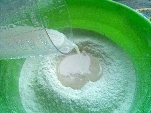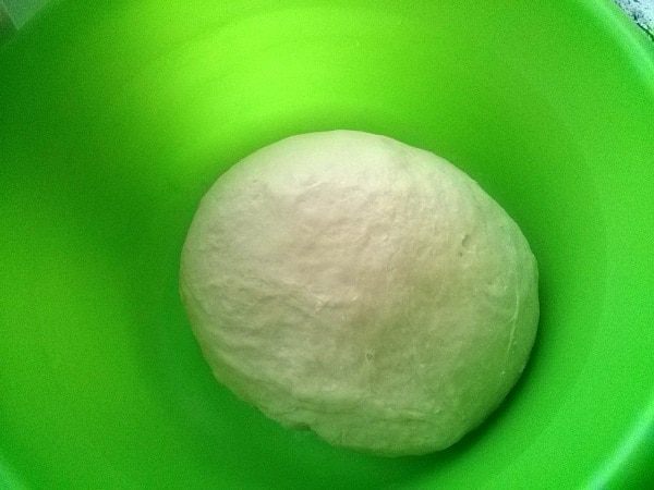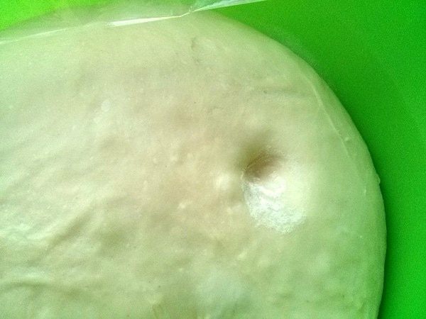 Как только мука взяла всю жидкость, добавляем по частям масло. Добавили кусочек, месим, пока оно не распределится по тесту, еще кусочек. Я замешивала тесто с помощью миксера, насадками для теста. Тесто получается гладким, эластичным, умеренно липнет к рукам. Готовое тесто закрываем пленкой и оставляем при комнатной температуре на 90 минут.