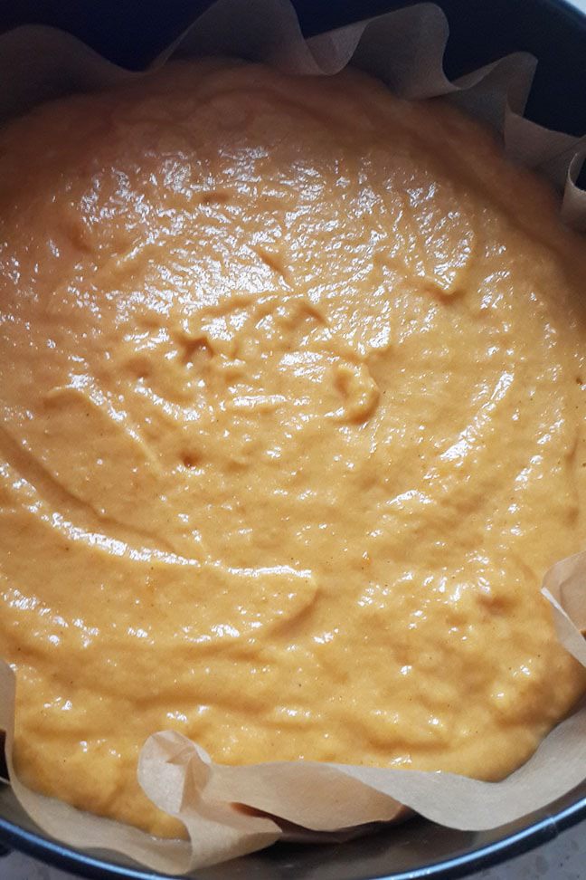 Измельчить тыкву блендером. Добавить сахар и ванилин, взбить венчиком. Добавить яйца, снова взбить. Добавить корицу, кардамон и мускат. Перемешать. Затем вмешать муку. Вылить в разъемную форму, покрытую пергаментом.