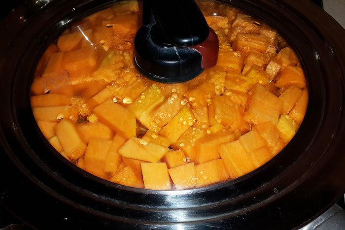 Очистить тыкву, порезать на кусочки. Потушить в сковороде под крышкой до мягкости.