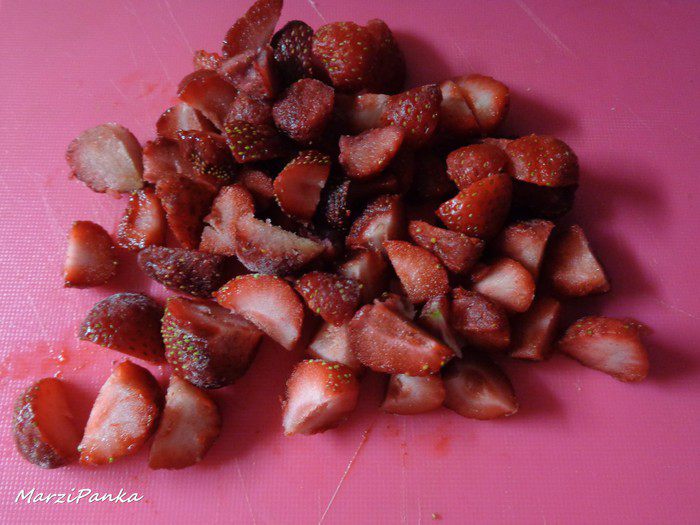 Клубнику порежем на четвертинки. У меня довольно мелкая клубника.