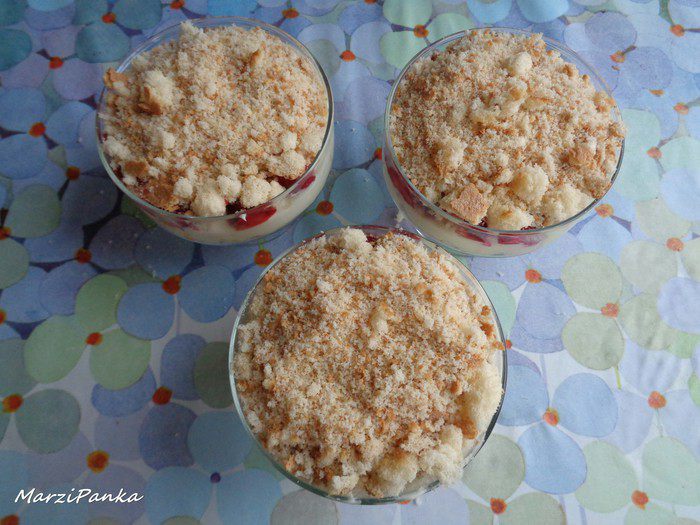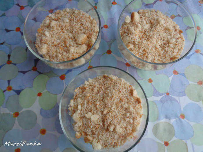 В креманки положить слой бисквитной крошки.