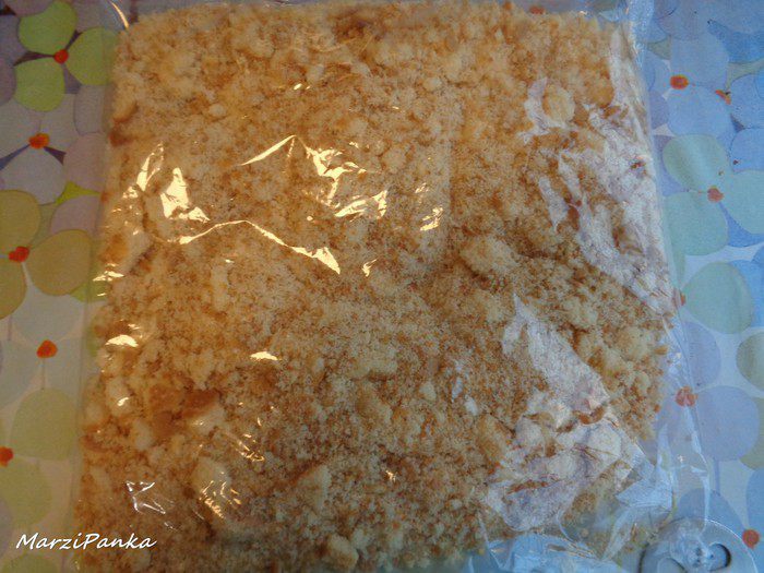 Готовый бисквит покрошить. Я это сделала прямо через пакет, размяв бисквит пальцами на произвольные кусочки. Очень удобно и чисто :)