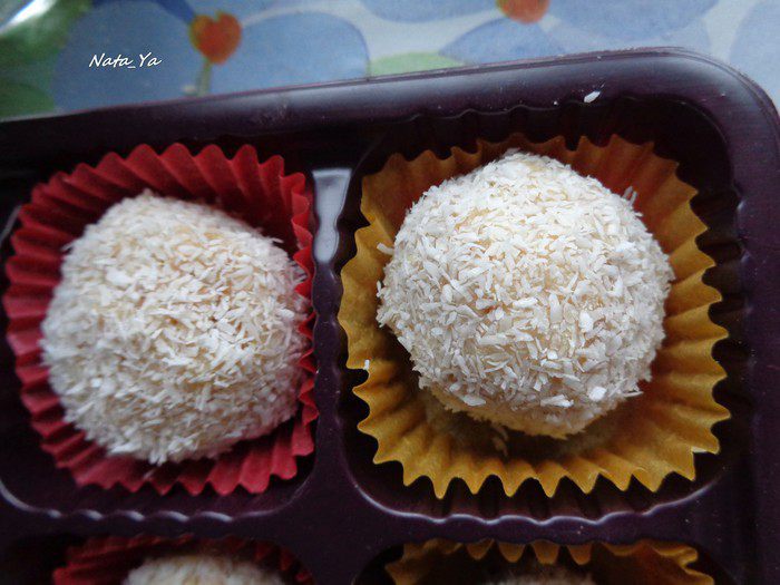 У меня осталось немного крема и бисквитной крошки. Я перемешала их между собой, сформировала шарики и обваляла их в кокосовой стружке. Получились изумительно-нежные конфетки.
