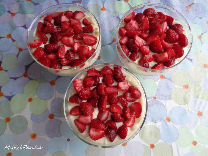 Кладем слой клубники поверх крема, немного вдавливая ягодки в крем.