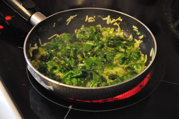 Растопить в сковороде сливочное и оливковое масло, обжарить в нем тимьян и лук-порей, до прозрачности лука. Добавить к луку шпинат, все хорошо протушить до испарения жидкости, затем отставить в сторону и остудить.