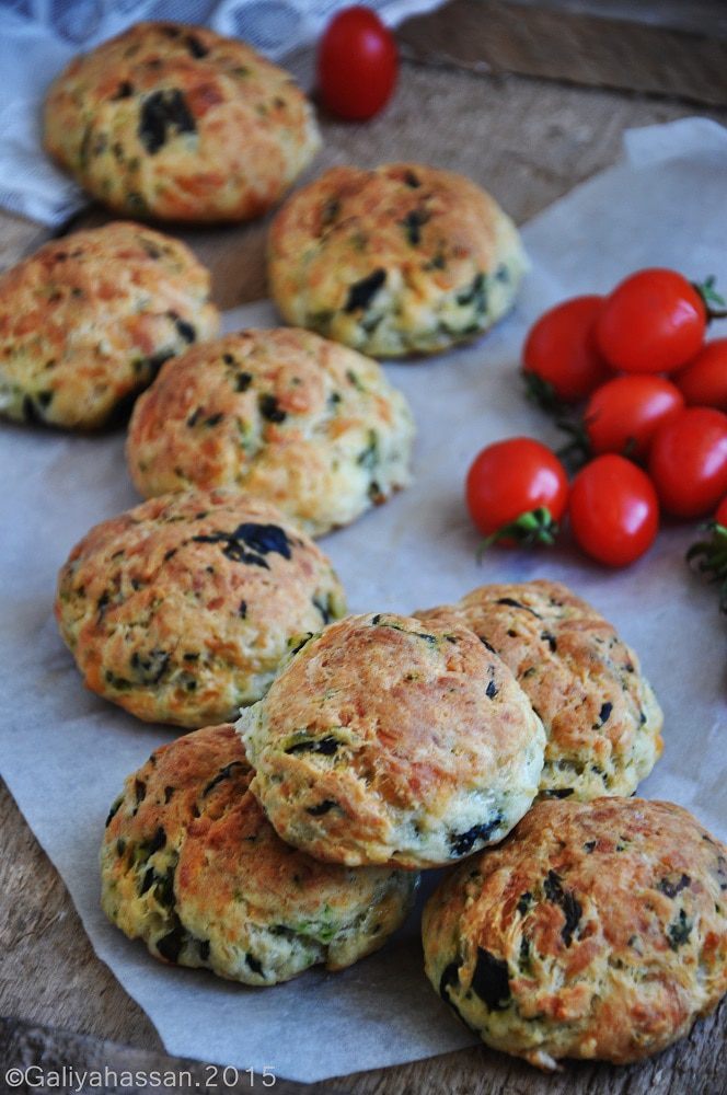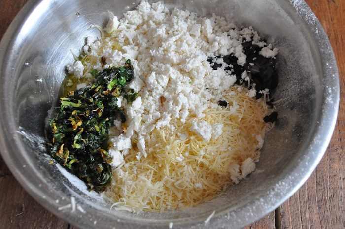 Муку с разрыхлителем просеять в чашку, смешать с сыром, фетой, шпинатом и базиликом, все перемешать тщательно.
