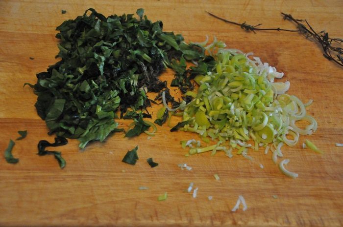 Лук порей помыть и тонко нарезать кольцами, оборвать с веточек листья тимьяна.
